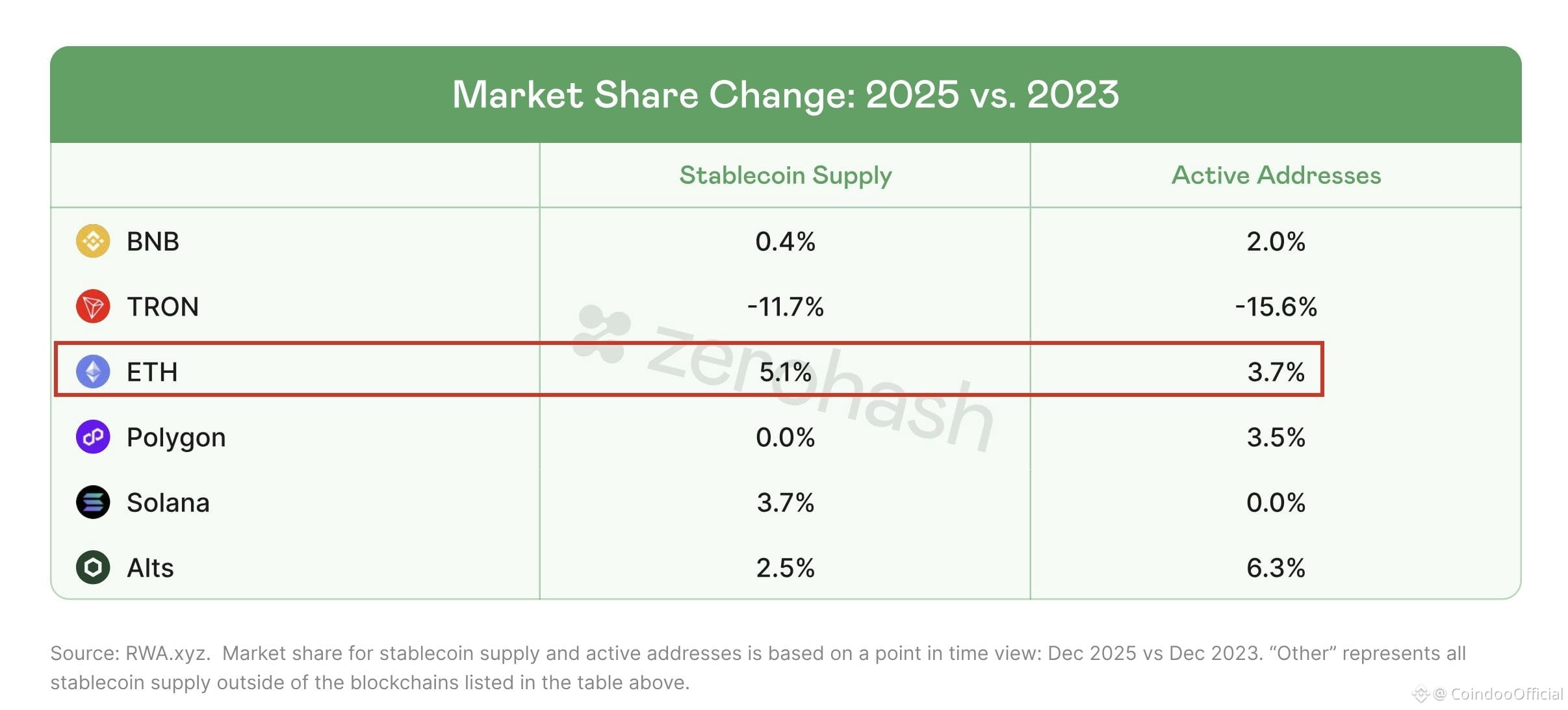 Ethereum is increasing its dominance in stablecoins, gaining market share in both supply and active addresses.
