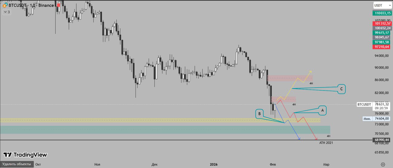 Sans constructions complexes : à l'ouverture de la session américaine, le marché peut simplement accélérer le mouvement vers le bas. En ligne de mire — la zone des anciens sommets du cycle précédent et le niveau psychologique de 70k $, qui attire traditionnellement le prix.