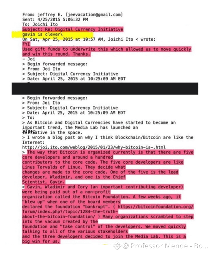 Un e-mail daté du 25 avril 2015, envoyé par Jeffrey Epstein à Joichi Ito (alors directeur du MIT Media Lab), révÚle une tentative délibérée de prendre le contrÎle des développeurs principaux de Bitcoin.