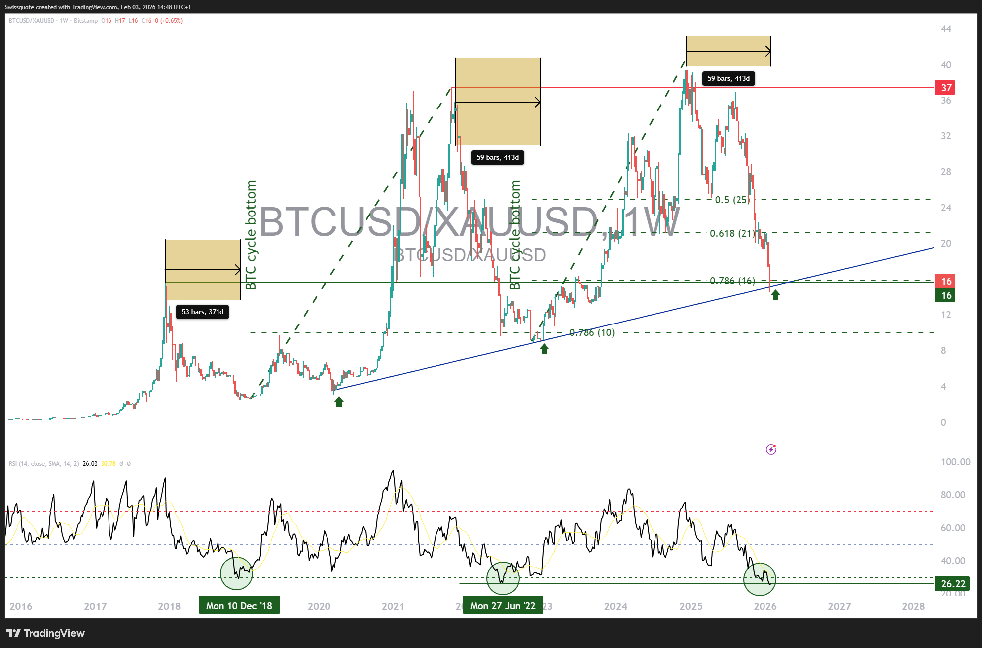 Ces derniers ont en fait entamé une phase corrective depuis la fin de la semaine dernière, marquant probablement l'éclatement d'une bulle spéculative qui était devenue particulièrement excessive depuis le dernier trimestre de 2025. L'analyse technique du ratio BTC/OR indique qu'un creux majeur pourrait être proche. Ce ratio entre actuellement dans sa 59e semaine de territoire de marché baissier, une durée qui correspond exactement à la fin du marché baissier de 2022. À cela s'ajoute une proportion clé : le ratio BTC/OR a corrigé environ 80 % de son cycle haussier précédent, encore une fois un niveau qui a coïncidé avec le creux final en 2022.