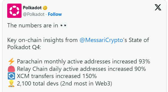 Le rapport Q4 met en évidence non seulement son impressionnante activité sur chaîne, mais souligne également son rôle dans le soutien aux innovateurs Web3 à l'échelle mondiale. Avec un total de 2 100 développeurs, Polkadot possède la deuxième plus grande communauté de développeurs dans l'espace Web3. Ce vaste réservoir de talents témoigne de l'attrait de la plateforme et de son potentiel à stimuler l'innovation dans l'industrie de la blockchain.