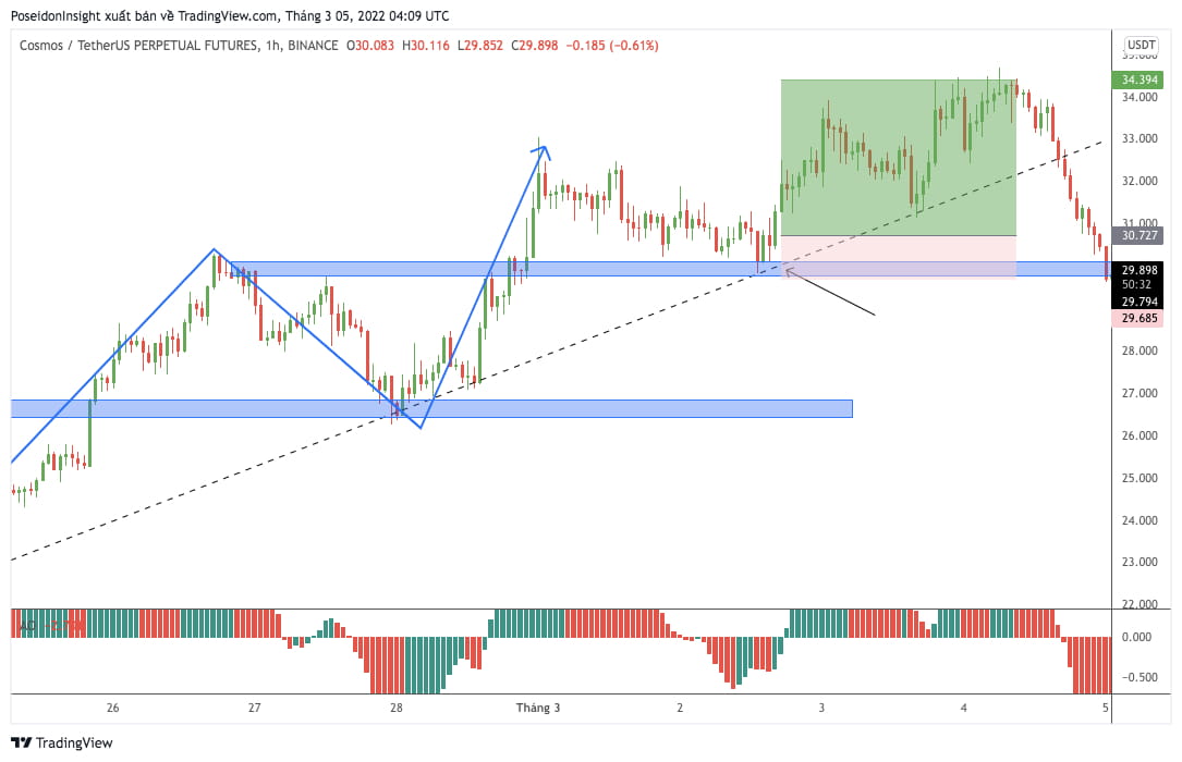 Sur cette image, ATOM a créé une tendance haussière dans le cadre 4H. A ce moment, on peut suivre la tendance 4H en attendant que le prix revienne sur deux zones de support importantes (bleu).