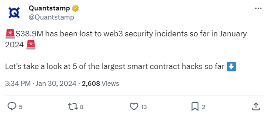 Quantstamp a révélé que des acteurs malveillants avaient réussi à drainer environ 38,9 millions de dollars de DeFi grâce à diverses attaques. Ces incidents impliquaient l'utilisation de contrats intelligents, des compromissions clés et des fraudes.