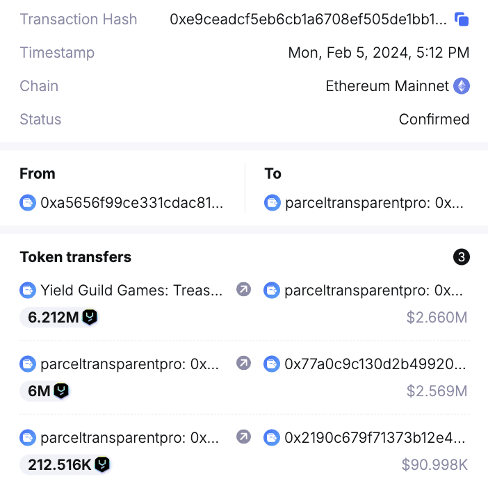 Il est à noter que ces jetons YGG ont été reçus par le portefeuille de Yield Guild Games : Treasury seulement 33 minutes avant le dépôt. L'adresse YGG Treasury responsable du transfert est [0xe30ed74c6633a1b0d34a71c50889f9f0fdb7d68a]