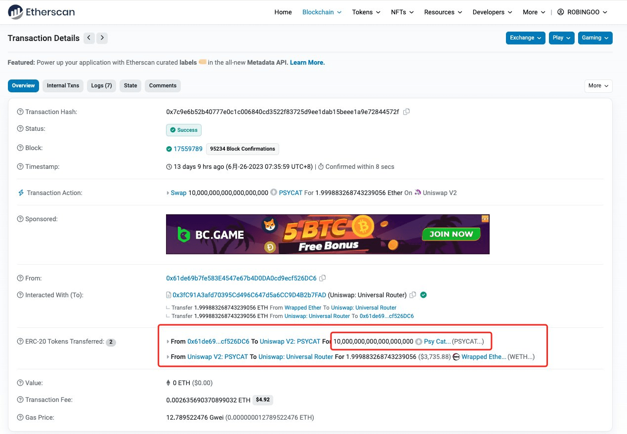 En plus d'appeler _router.transfer(to) et _router.Path(from) pendant le processus de transfert, le contrat _router n'est pas open source, le déployeur peut donc le modifier à volonté pour atteindre son objectif de dissimulation. Les modifications ci-dessus du solde d'adresse et l'appel à _router ont provoqué que l'adresse 6DC6 ait 1 000 000 000 B de $PSY supplémentaires à partir de rien :