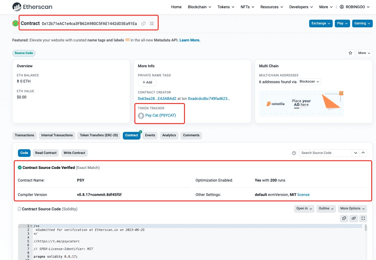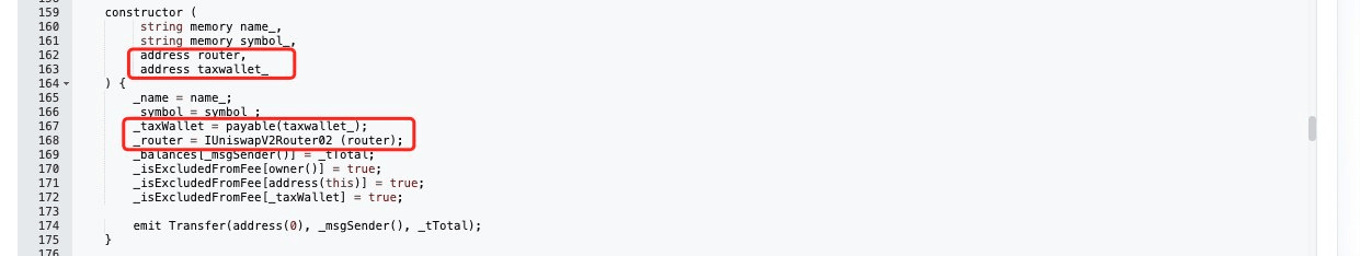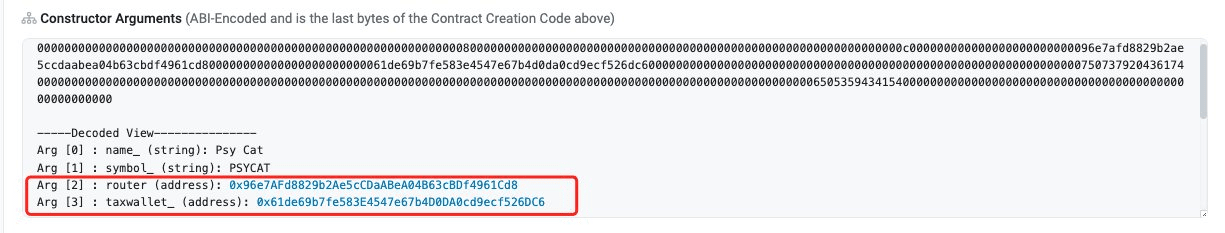 En revenant sur le code du contrat de $PSY, le routeur et le taxwallet_ sont définis dans le Constructeur, _router est une variable de type IUniswapV2Router02. IUniswapV2Router02 est l'interface de contrat de routeur d'Uniswap V2, mais ici elle est initialisée à la valeur du routeur. paramètre et le paramètre du routeur est La valeur peut être trouvée sous « Arguments du constructeur » sous le code source comme suit :