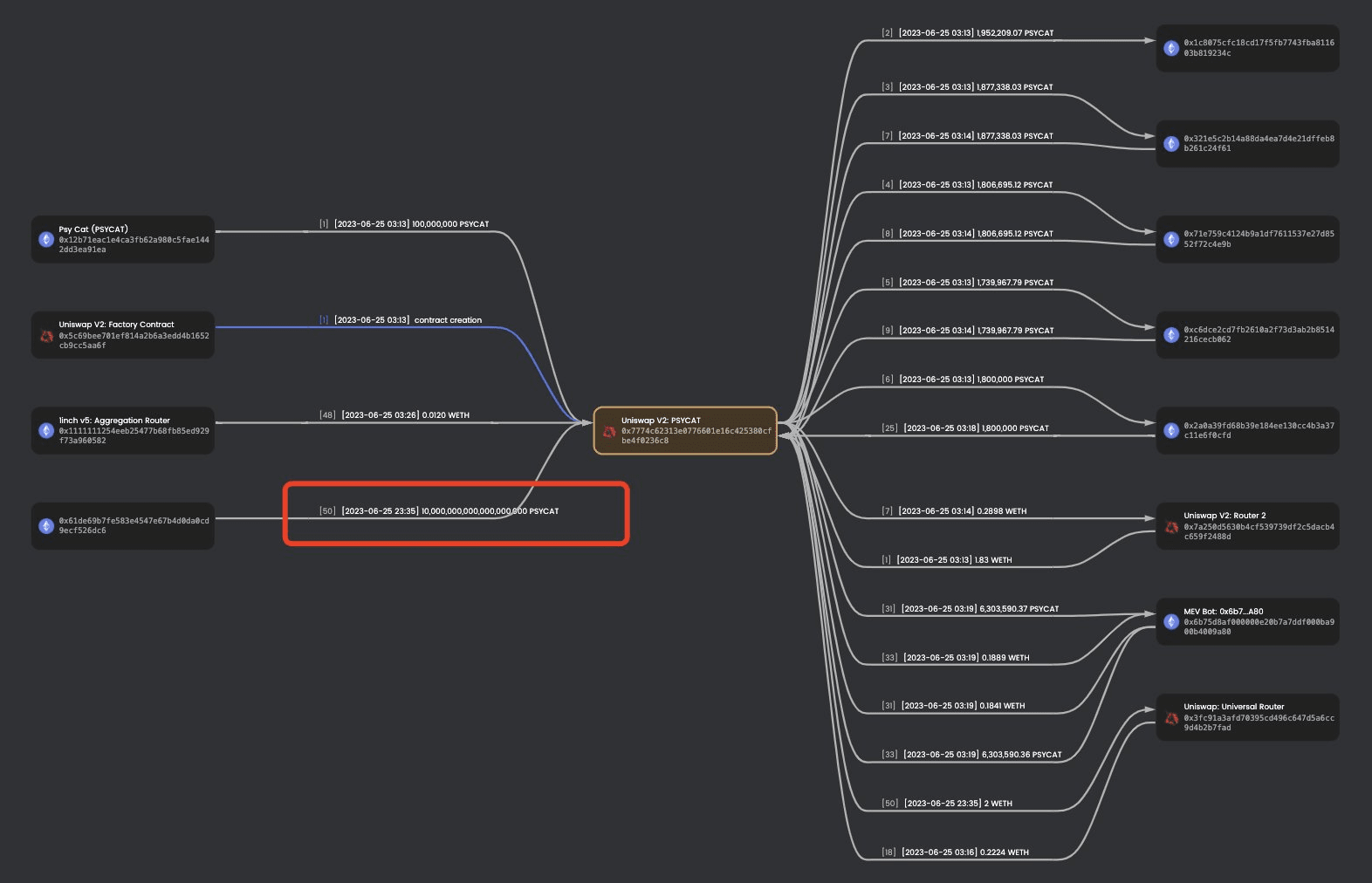 Le principal problème : un chien local $PSY Du point de vue de la chaîne, le code est open source, ce qui met également LP dans un trou noir et perd ses autorisations. Mais en fait, il existe une adresse tierce qui possède une énorme quantité de jetons (dépassant de loin la quantité initiale de jetons), et les a ensuite tous vendus en même temps, et cette adresse tierce n'a qu'un historique de vente ( transfert sortant) $PSY, ce qui est complètement Il n'y a aucune trace de transfert. En d’autres termes, une énorme quantité de jetons est apparue « de nulle part » dans cette adresse tierce.