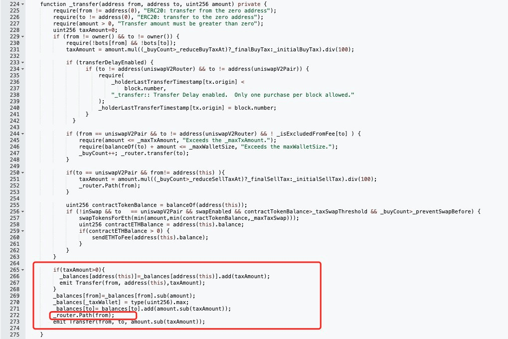 2. Ajoutez secrètement un code maléfique après la fonction de transfert pour modifier le solde du jeton de l'adresse fiscale, et chaque fois que la fonction _transfer _router.transfer(to) et _router.Path(from) sont exécutées, elles seront appelées pour réaliser le mal but.