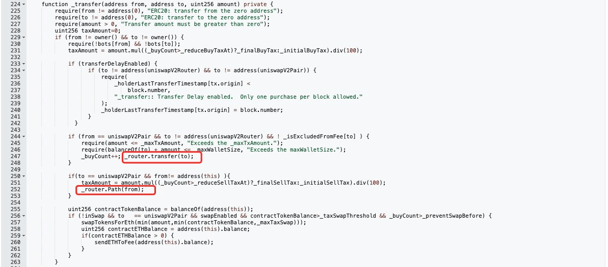 Vous pouvez voir que _router est utilisé dans diverses fonctions du contrat de jeton, comme dans la fonction _transfer, _router.transfer(to) et _router.Path(from), qui appellent tous le contrat de routeur Uniswap (voici l'adresse 1Cd8) La fonction. Transfer et Path ne sont pas des fonctions standards du contrat du routeur Uniswap, mais sont des fonctions personnalisées par ce fraudeur :