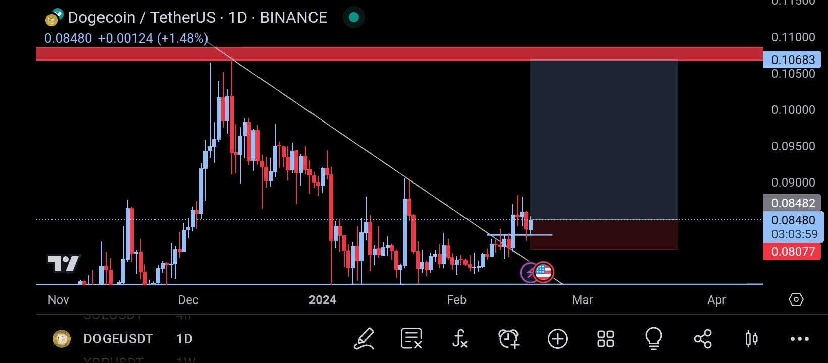 Sur la période quotidienne, le prix a rebondi sur un niveau de support mineur. En outre, la ligne de tendance empêchant la hausse des prix a été brisée. L’objectif de niveau suivant pour la pièce DOGE est de 0,1 $. #dogecoin #Write2Earn