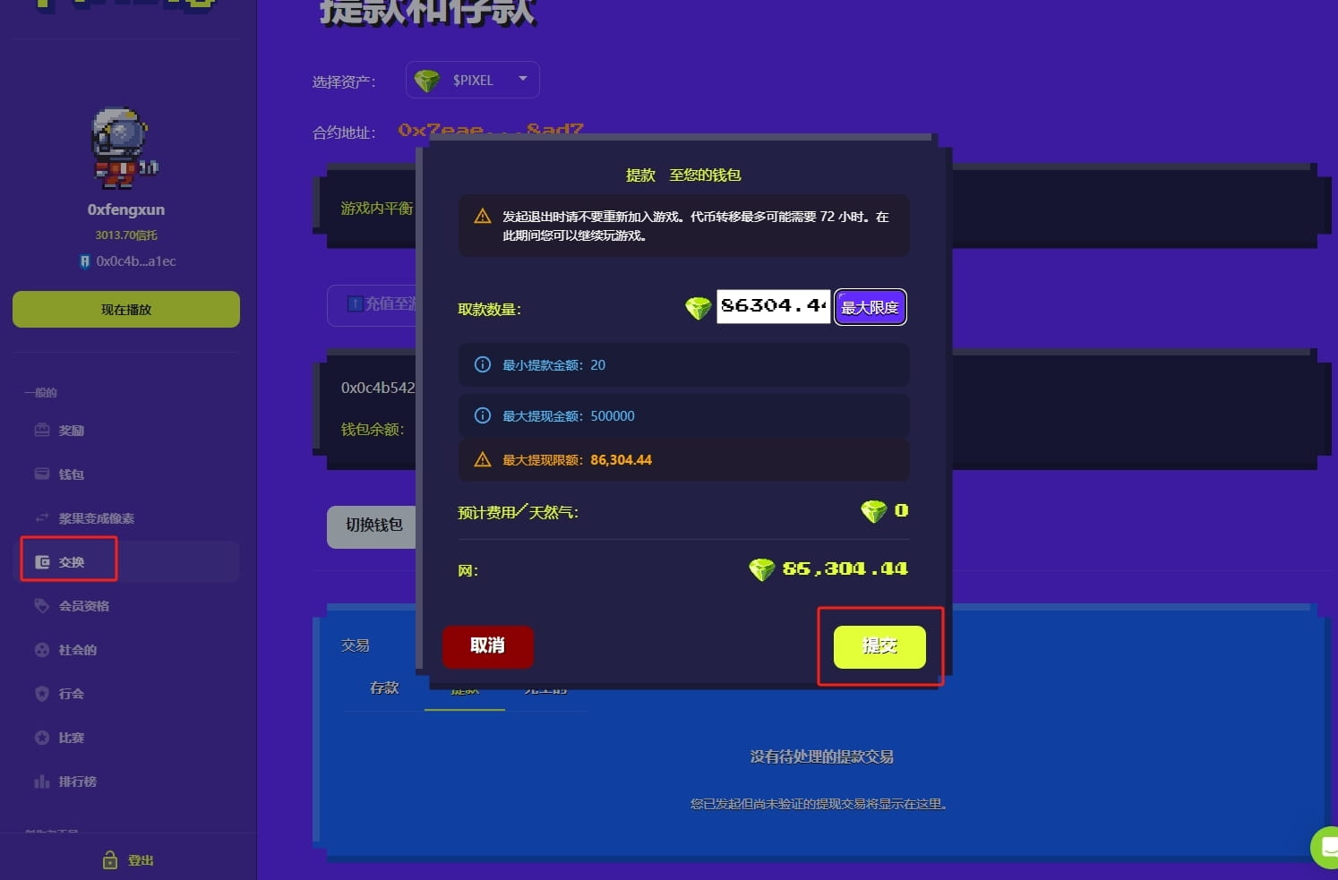 Cliquez sur le tableau de bord du jeu pour accéder à l'échange de points, sélectionnez des pixels et retirez de l'argent. Voir l'image ci-dessous pour plus de détails.