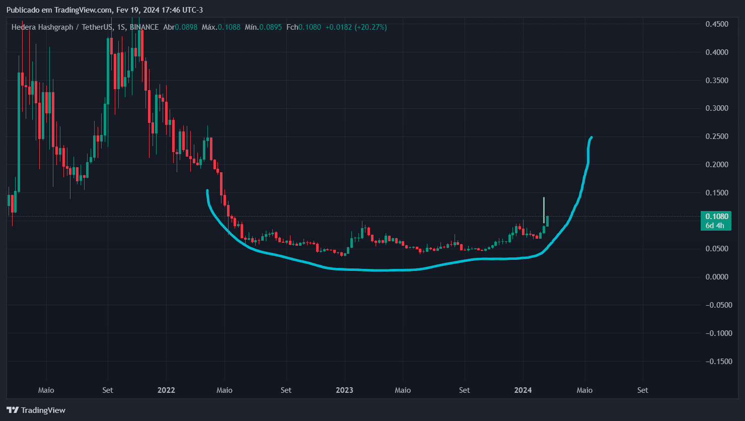 Mais quel est le potentiel de hausse maximal du HBAR ? En regardant de plus près le graphique hebdomadaire, nous remarquons que nous sommes toujours au plus bas d'un mouvement connu sous le nom de « Running Bottle », qui pourrait initialement conduire le prix du HBAR à atteindre 0,1406 puis 0,2447.