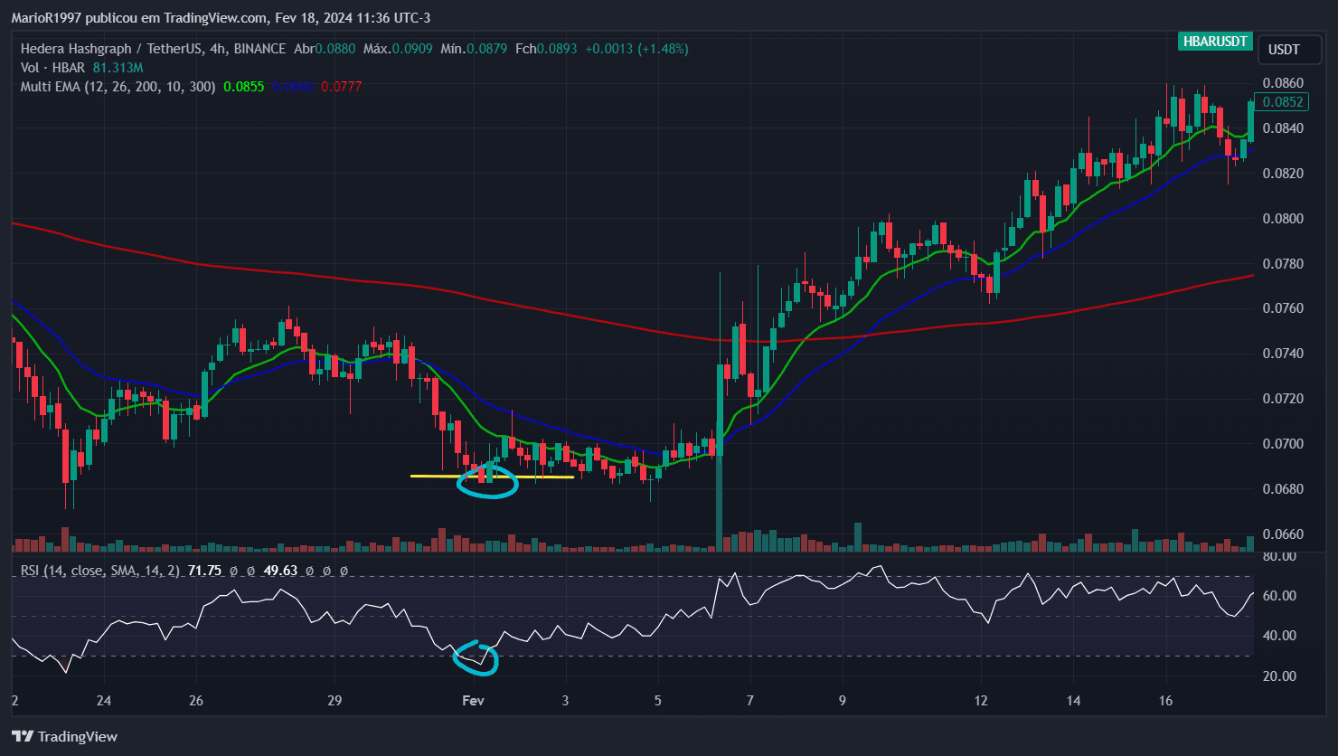 Sur le graphique de quatre heures, nous avons déjà identifié notre support par rapport au graphique hebdomadaire, puisque le RSI a atteint le niveau de survente (30). Lorsque nous sommes dans une tendance haussière et que le niveau de survente est atteint sur le graphique de quatre ou douze heures, cela indique l'établissement d'une nouvelle base de prix pour l'actif. Cela suggère que le potentiel de hausse de $HBAR pourrait être assez important.
