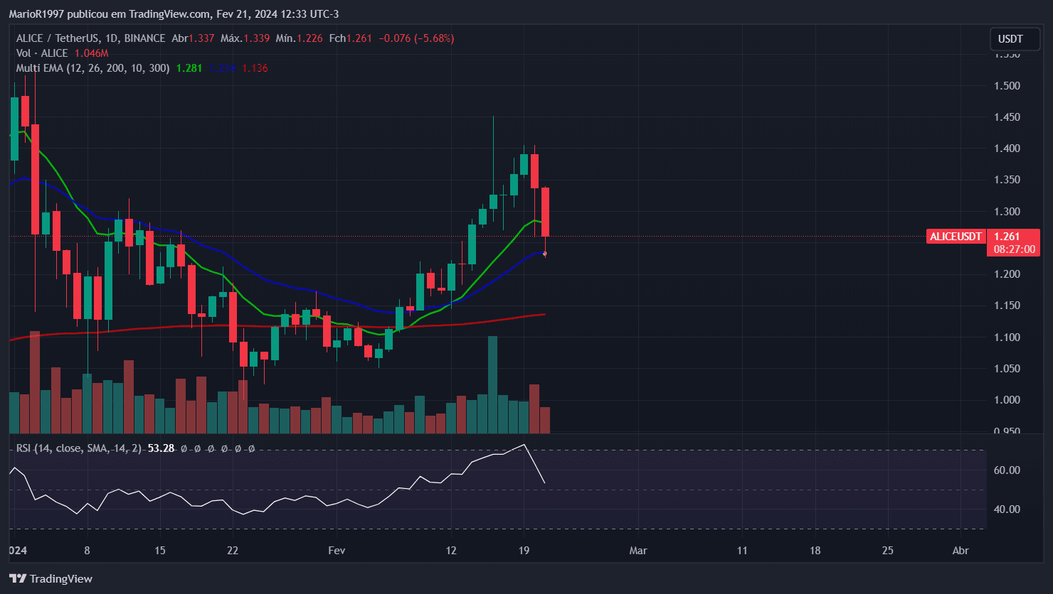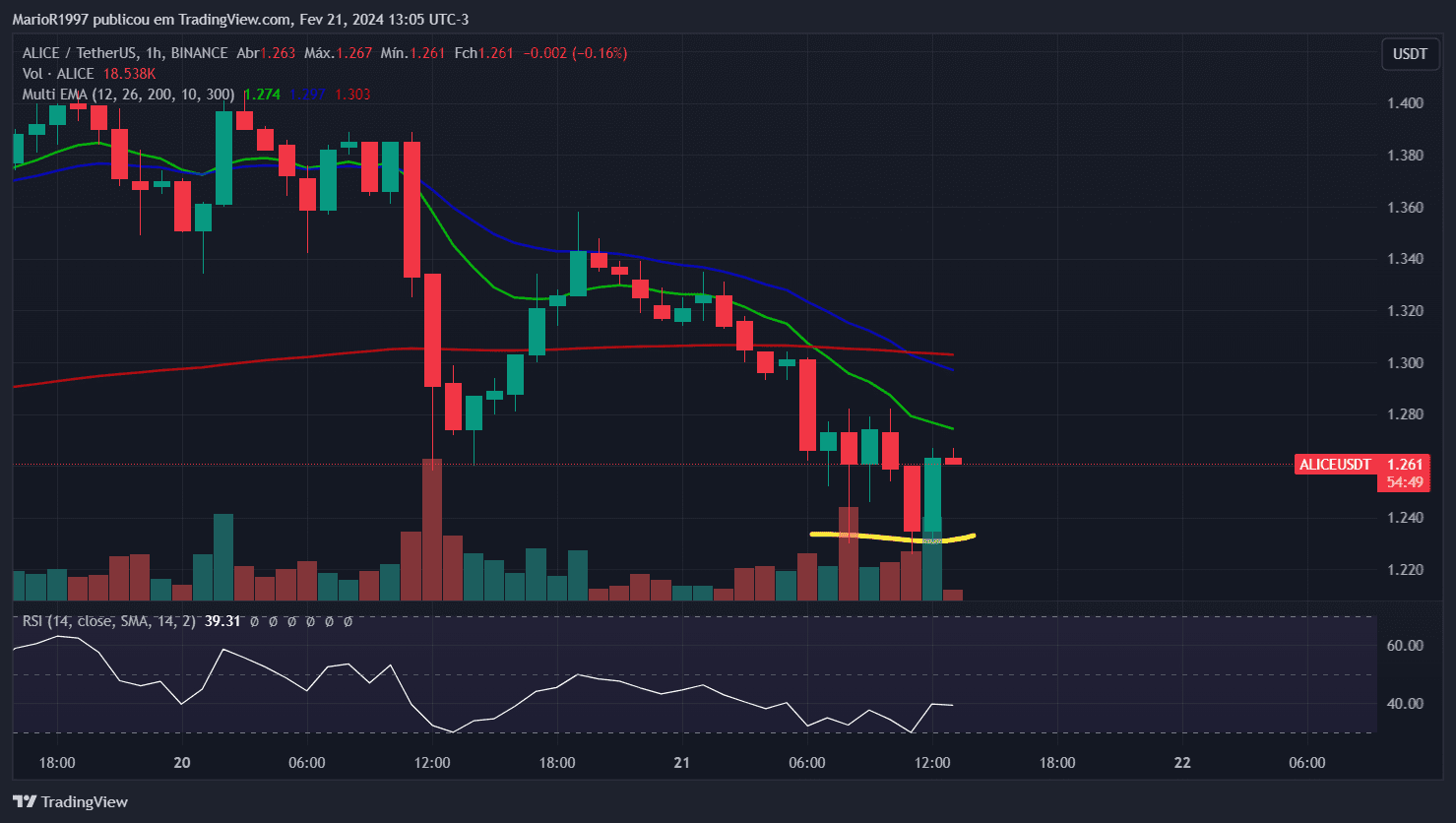 Un exemple est la pièce $ALICE , qui montre actuellement des signes de formation d'une base de prix possible, comme en témoigne l'indicateur de l'indice de force relative (RSI) atteignant le niveau de survente sur le graphique d'une heure (1H). .