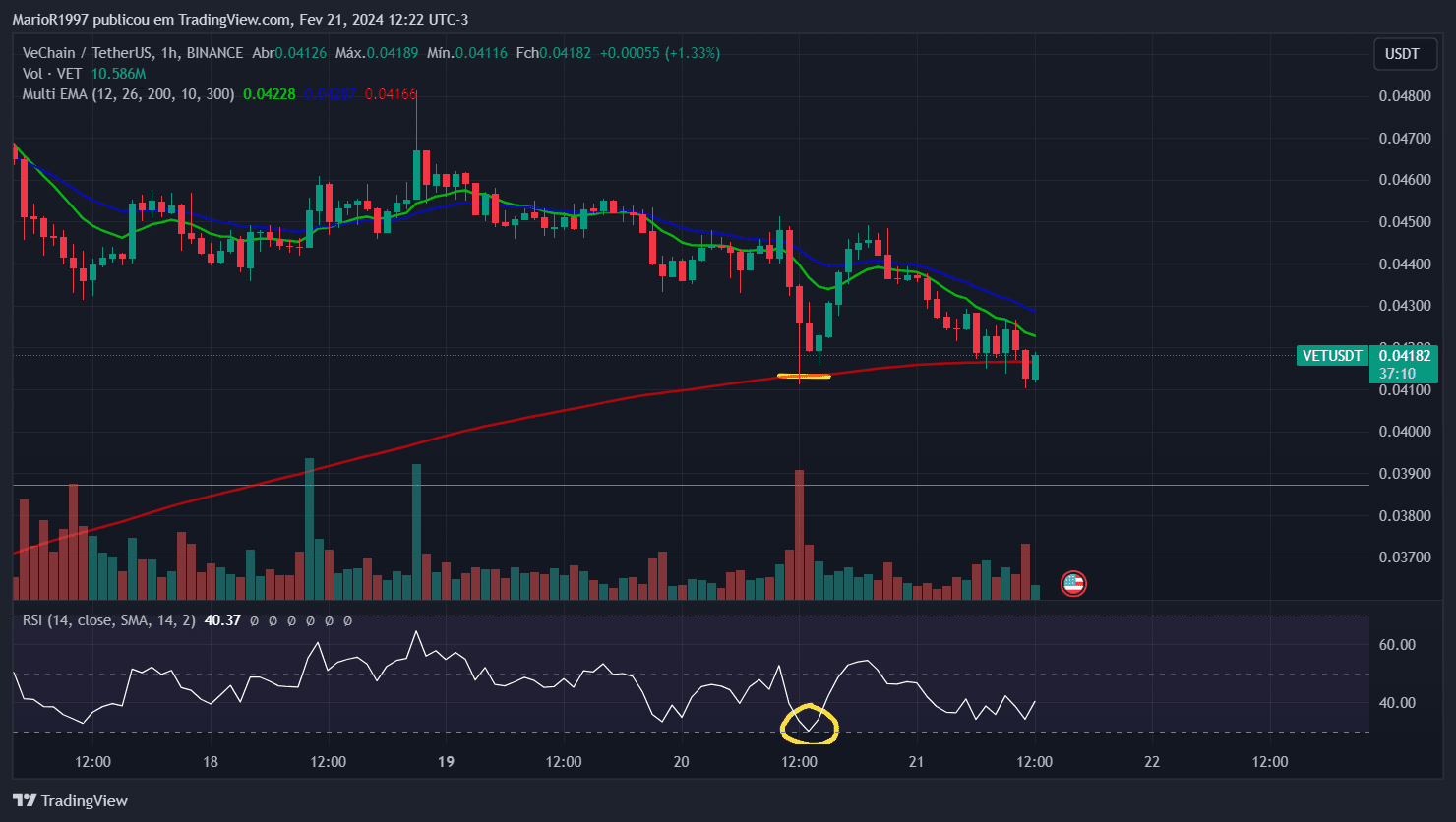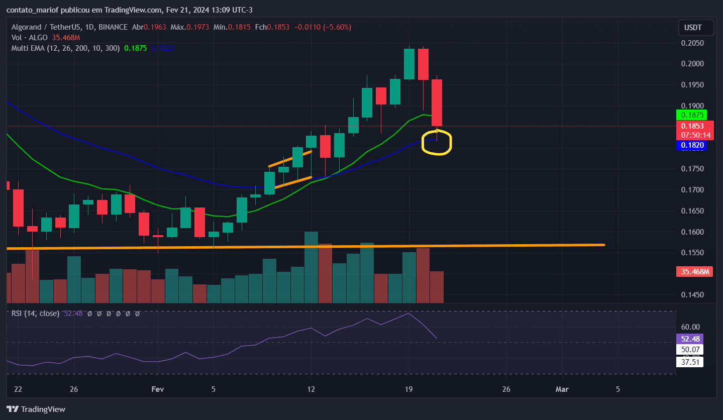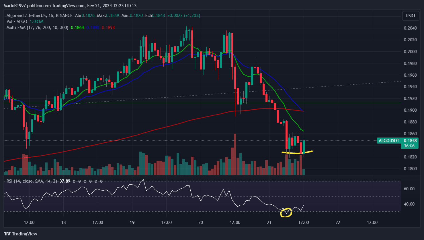 Un autre exemple est la pièce $ALGO , qui suit un modèle similaire. Sur le graphique horaire, nous avons également atteint le niveau de survente sur le RSI, et sur le graphique journalier, l'actif utilise l'EMA à 26 périodes comme support.