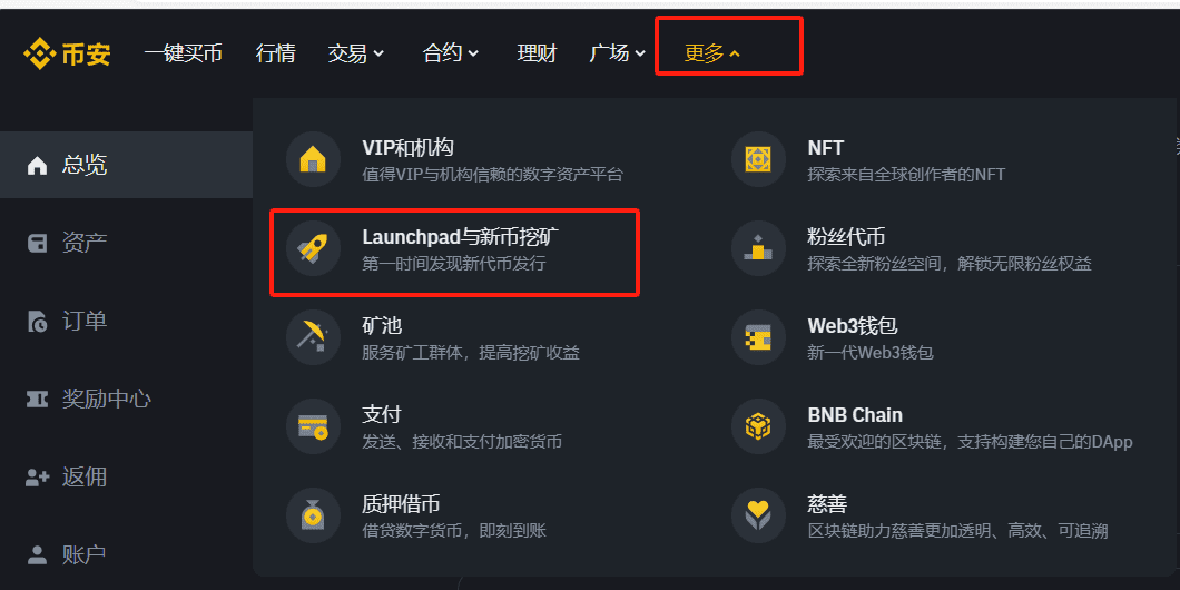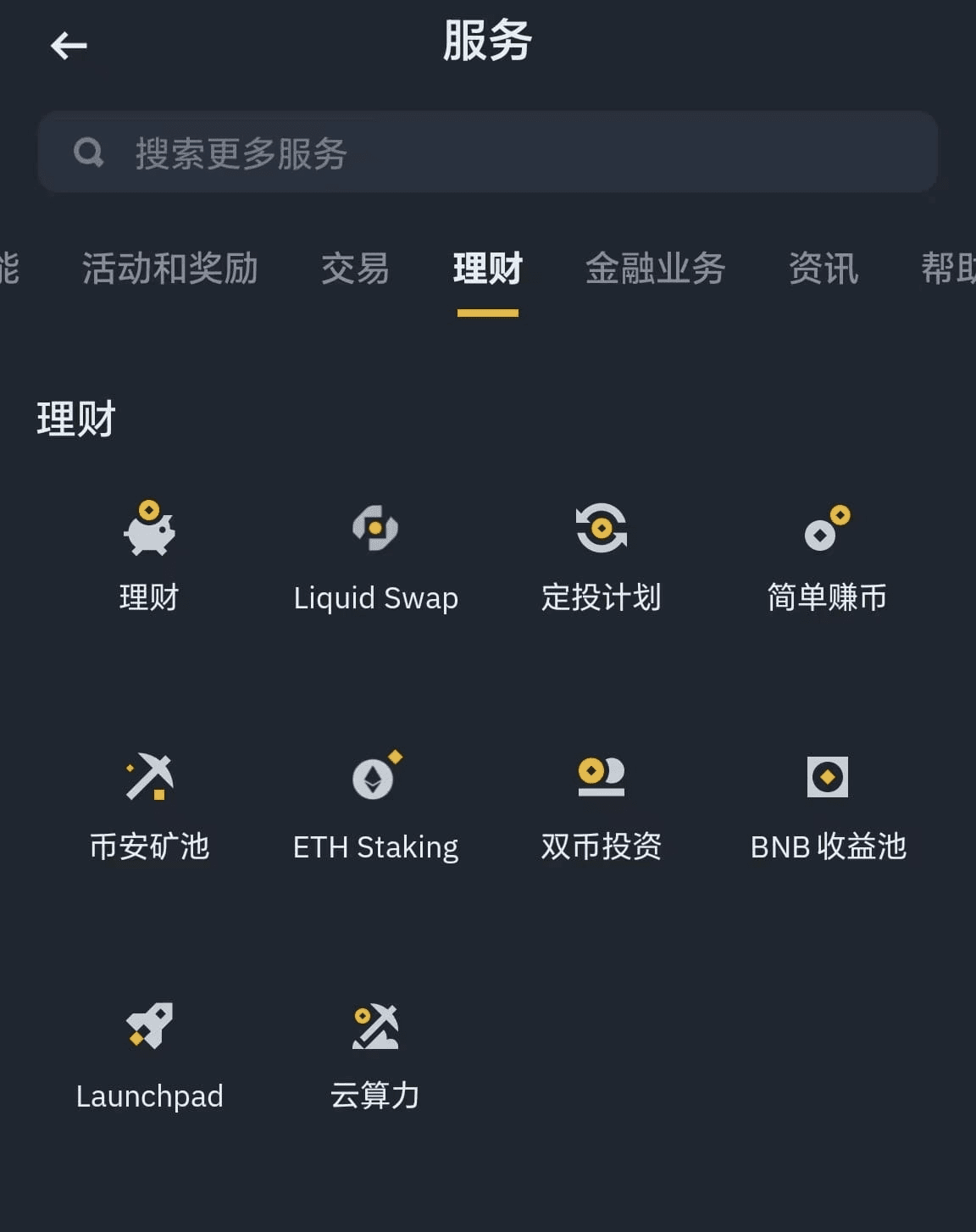2.更多里面找到理财,就能够找到launchpad了,质押方法同样如此
