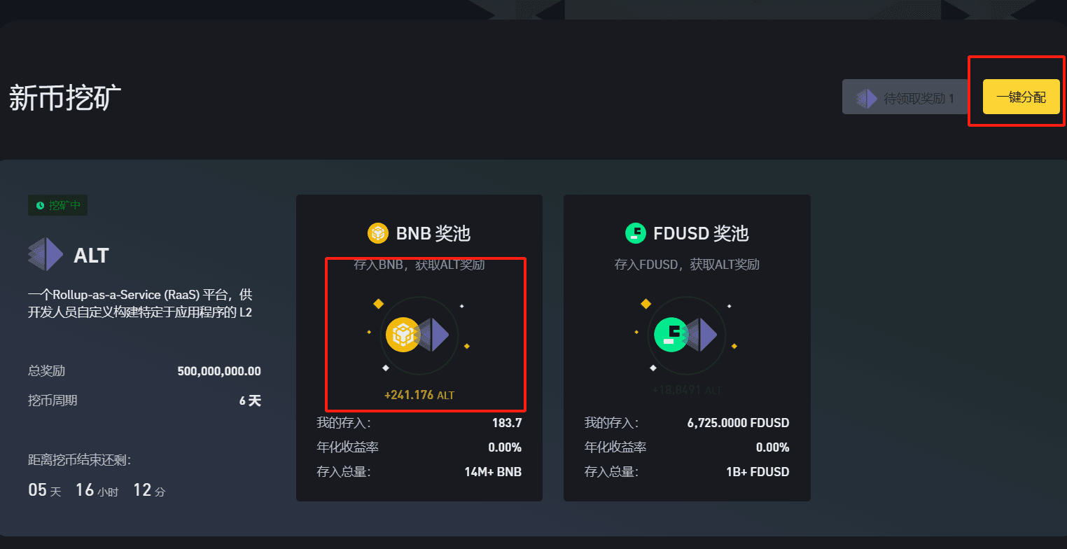 2.进入Launchpad后,可以选择一键分配,也可以直接点BNB或者FDUSD的矿池进入质押。