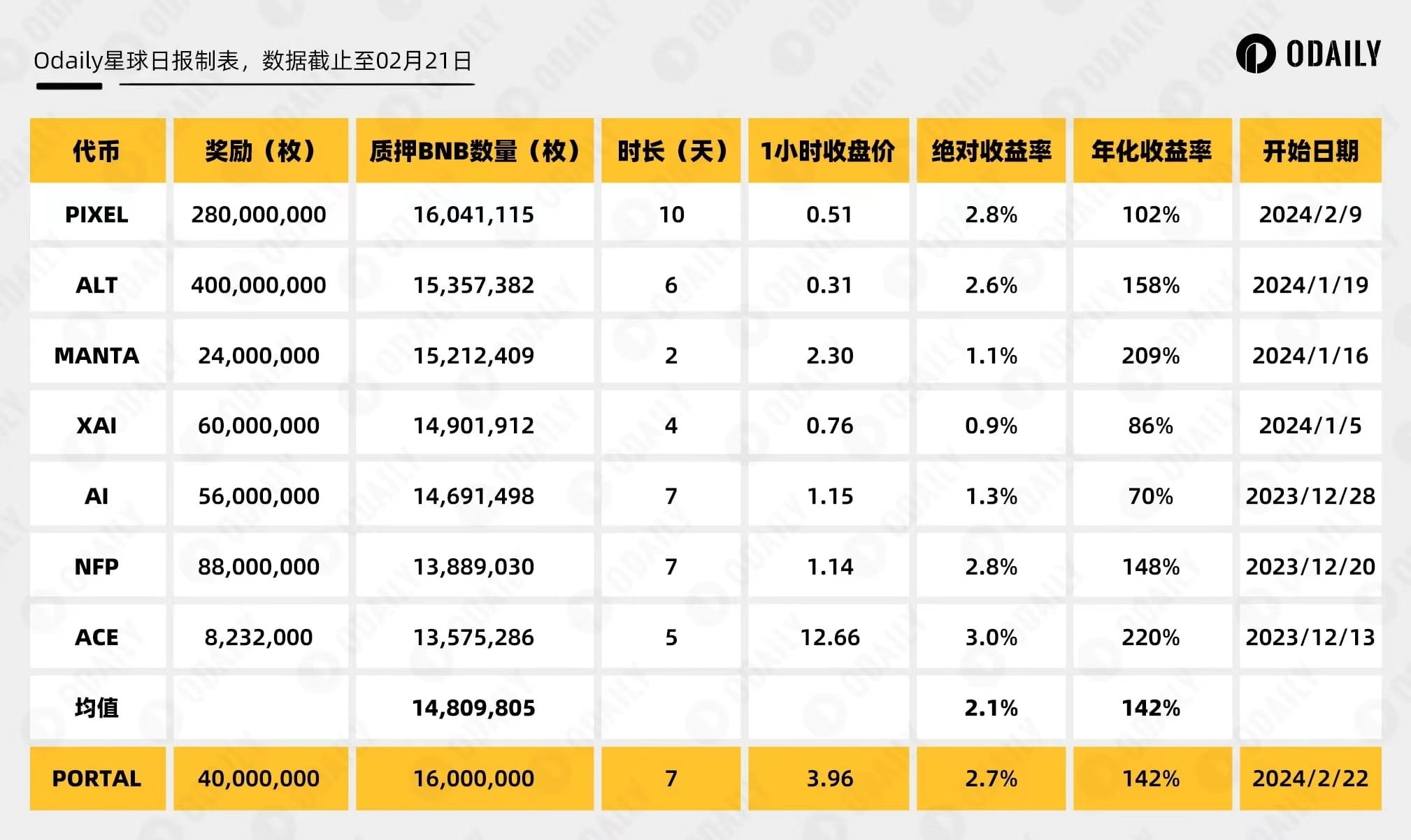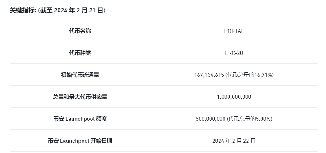Au 21 février 2024, l'offre totale de PORTAL est de 1 000 000 000 et l'offre en circulation après cotation est de 167 134 615 (représentant environ 16,71 % de l'offre totale de jetons).