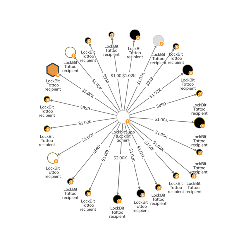 Par exemple, en 2022, un administrateur de Lockbit connu sous le pseudonyme en ligne LockBitSupp a annoncé qu'il paierait 1 000 $ à toute personne se faisant tatouer le logo Lockbit.