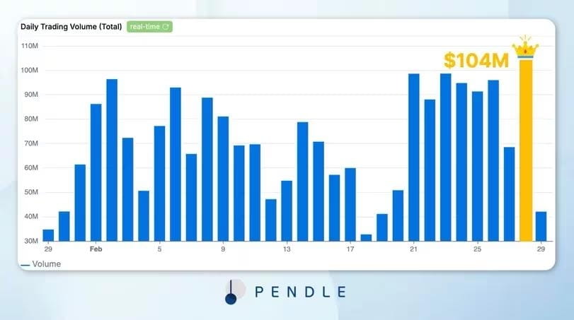 Le volume des échanges sur le protocole de tokenisation Pendle Finance a atteint un niveau record de plus de 100 millions de dollars. Pendle permet aux investisseurs de diviser les actifs générateurs de rendement, tels que l'éther mis en jeu, en un jeton de rendement et un jeton principal, créant ainsi une plateforme de trading pour échanger ces jetons. Fournit un service de pool de liquidités.