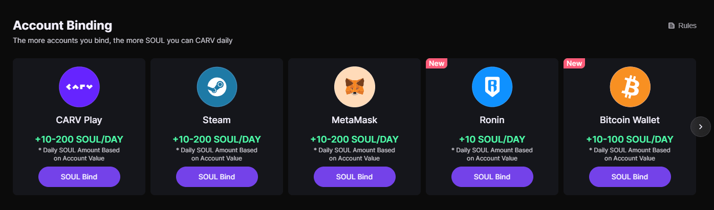Carv est une organisation DAO Ethereum Layer 2 qui vise à établir des identifiants d'identité de jeu pour les utilisateurs afin de permettre l'affichage des réalisations, la découverte d'amis et de jeux et la monétisation directe. Le protocole CARV est une plate-forme de préservation de la vie privée basée sur le consentement où les utilisateurs contrôlent, regroupent et monétisent les identités et les données (D2E). Les participants créent des identifiants CARV, complètent leurs comptes personnels, se connectent à miner SOUL via quatre chaînes et obtiennent enfin la proportion correspondante de largages.