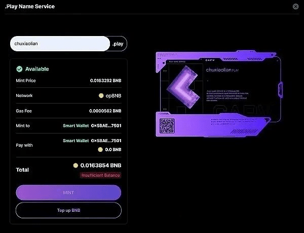 Vous devez préparer des opbnb. La connexion nécessite une petite quantité d'opbnb. Après avoir utilisé le portefeuille pour vous connecter au site officiel, un portefeuille AA sera automatiquement généré depuis le réseau opbnb dans votre propre portefeuille vers l'AA. portefeuille généré par le site officiel. Après la recharge, créez un identifiant CARV afin que le réseau génère une adresse distincte pour vous.