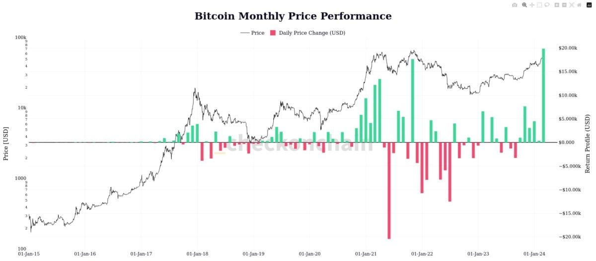 "Unreal… Février 2024 a imprimé la bougie Bitcoin de 19,84 000 $, la plus forte augmentation mensuelle du dollar de l'histoire", a commenté Checkmate.