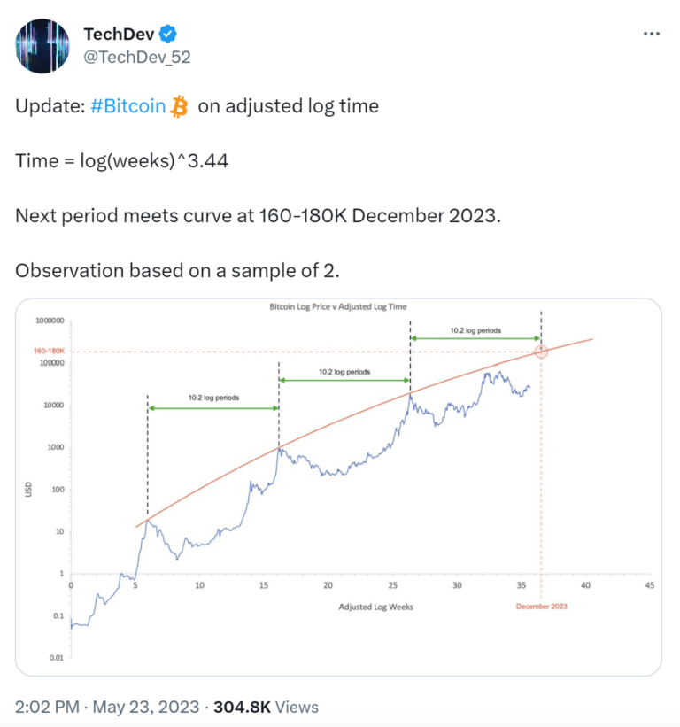 L'analyste crypto TechDev_52 a analysé les sommets de Bitcoin comme une série de cycles sur une échelle de temps logarithmique. Selon cette méthode d'analyse unique, le prochain cycle devrait culminer avec un pic en décembre 2023 compris entre 160 000 et 180 000 dollars.