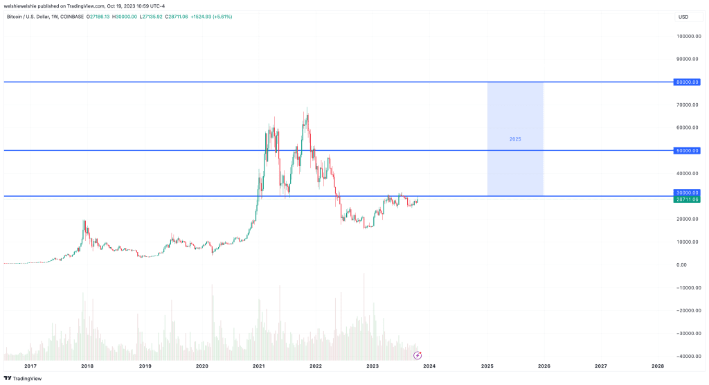 Alors que le prix actuel du Bitcoin, 28 455 $, est bien inférieur (58,6 %) à cet ATH, ces mouvements précédents nous donnent une fenêtre sur ce qui pourrait arriver avec le prix du Bitcoin en 2024.