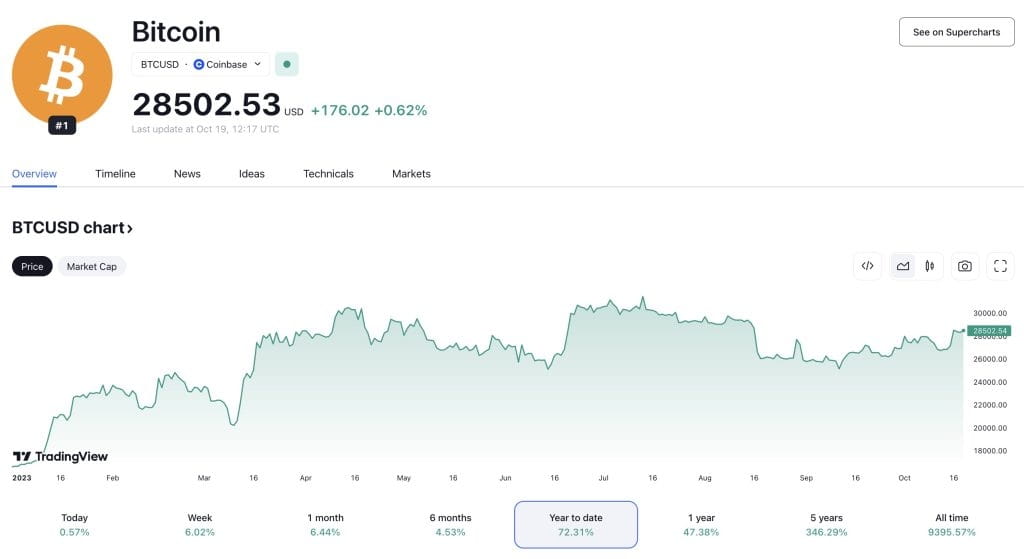 Une autre baisse a ensuite suivi à la mi-septembre – bien que la ligne de résistance de 25 000 $ n'ait pas été franchie. En octobre, le prix s'est échangé entre 26 000 $ et 29,5 000 $. Il a également flirté avec 30 000 $ à une occasion à la mi-octobre grâce à un faux rapport sur un ETF Bitcoin approuvé. Malgré tout cela, Bitcoin s’échange en hausse de 25 % par rapport à début octobre.