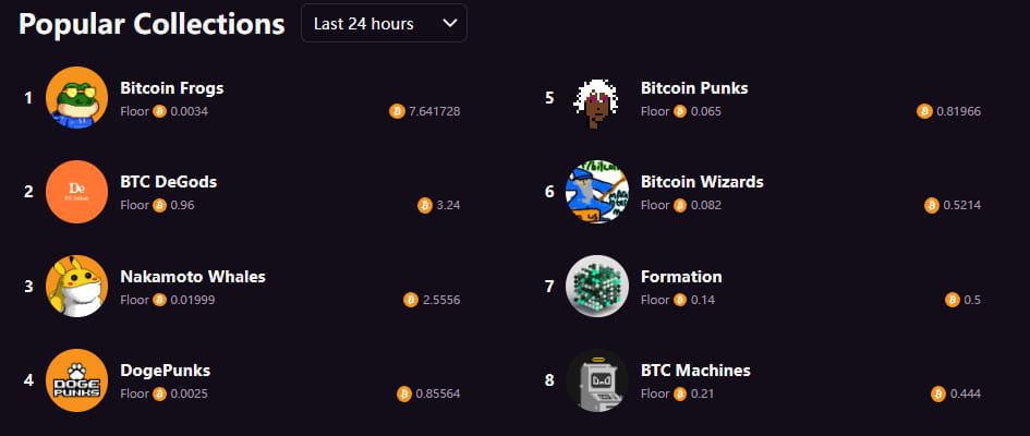Sur le marché commercial Magiceden, nous pouvons voir que le volume de transactions le plus élevé au cours des dernières 24 heures est Bitcoin Frogs, avec un volume total de 10 000, un total de 54,7466 BTC négociés et le prix plancher est de 0,0034 BTC.