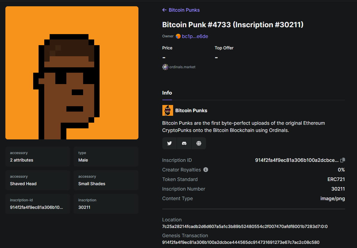 Bitcoin Punk peut être acheté sur le marché des ordinaux. Le prix plancher actuel est de 0,083 BTC, soit environ plus de 2 200 dollars américains.