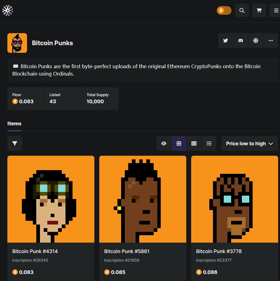 Bitcoin Punks a été le premier à télécharger les octets Ethereum CryptoPunks originaux sur la blockchain Bitcoin en utilisant le protocole Ordinals. L'offre totale est de 10 000 et un total de 8 500 ETH ont été échangés.