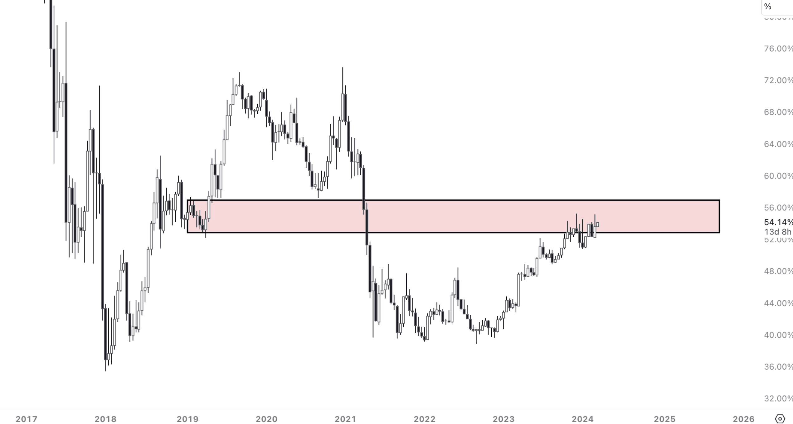4/➮ La domination du Bitcoin atteint actuellement un sommet jamais vu depuis 2021, démontrant que la liquidité y reste concentrée.