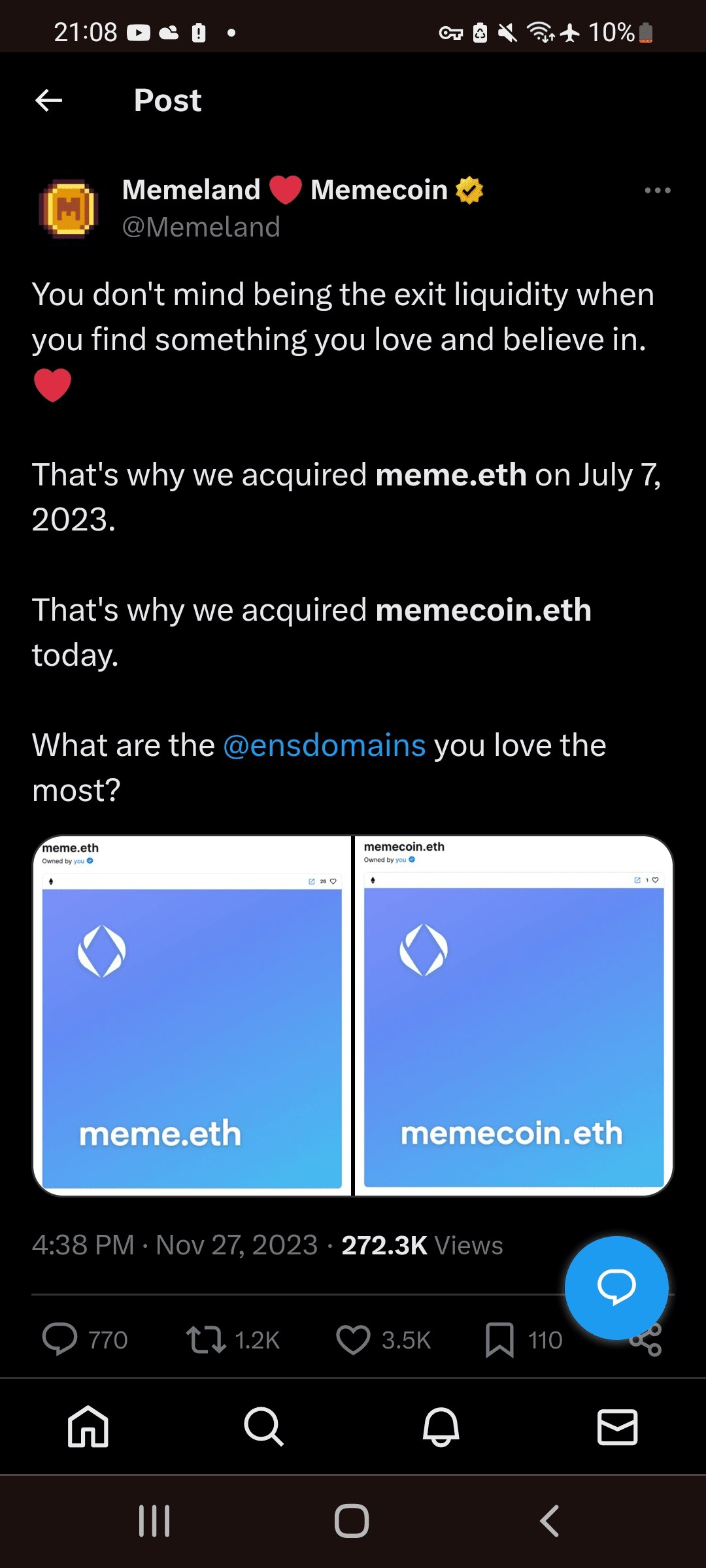 Au moment de la rédaction de cet article, le domaine « the-memeland.eth » est disponible pour 10 000 dollars, promettant à un acheteur potentiel un bénéfice d'au moins 40 000 dollars. Comme on le sait, l'équipe Memeland a déjà investi des sommes importantes dans l'acquisition de domaines ENS l'année dernière. La question se pose : quand décideront-ils d’acheter cet actif ?