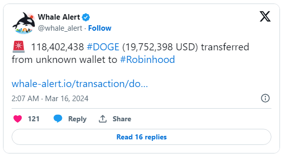 Dans des rapports récents de Whale Alert, une plateforme dédiée à la surveillance et à la divulgation des mouvements notables sur diverses blockchains, il a été mis en évidence un flux considérable de Dogecoin vers l'application de trading Robinhood.