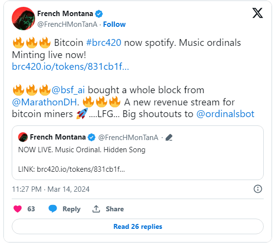 French Montana a ouvert une nouvelle page dans la relation entre la musique et les crypto-monnaies en devenant le premier artiste grand public à achever l'incorporation d'une chanson, « Bag Curious », dans la blockchain Bitcoin.