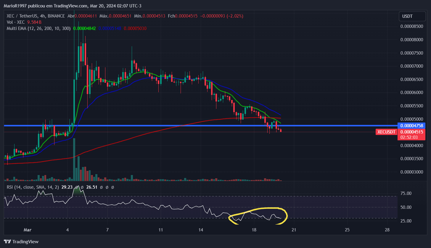 Un exemple est $XEC , qui est actuellement au support sur le graphique hebdomadaire (1W). De plus, nous avons observé que sur le graphique de 4 heures (4H), l'indicateur de l'indice de force relative (RSI) a atteint le niveau de survente (30), suggérant la possibilité de formation d'une base de prix.