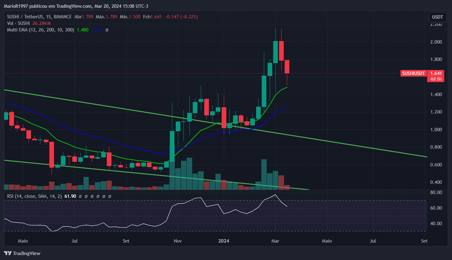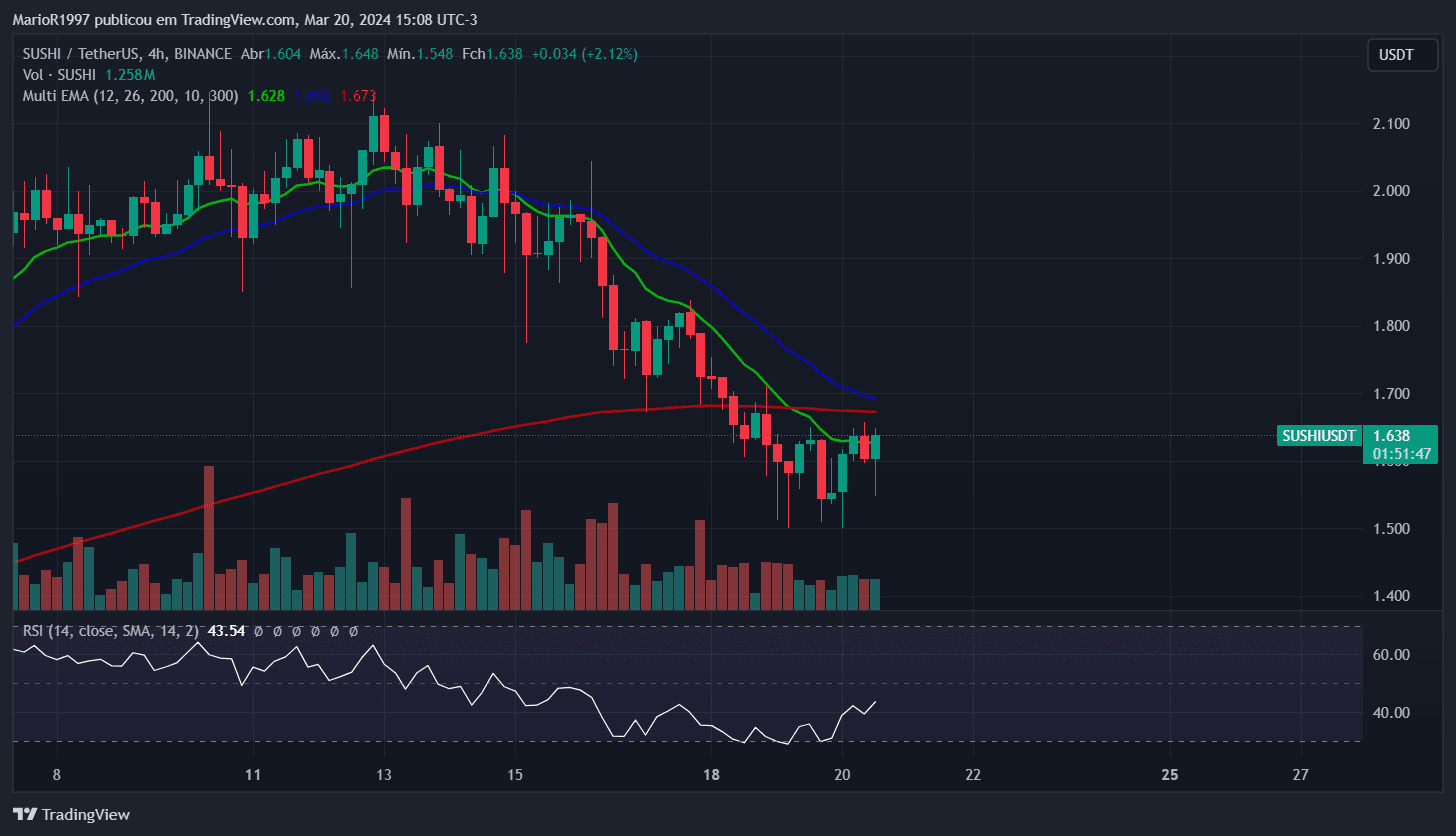 SUSHI, lors de l'analyse du graphique hebdomadaire, semble résister à la moyenne mobile sur 12 périodes, le RSI indiquant une survente sur le graphique de 4 heures, il reste toujours dans une tendance haussière.