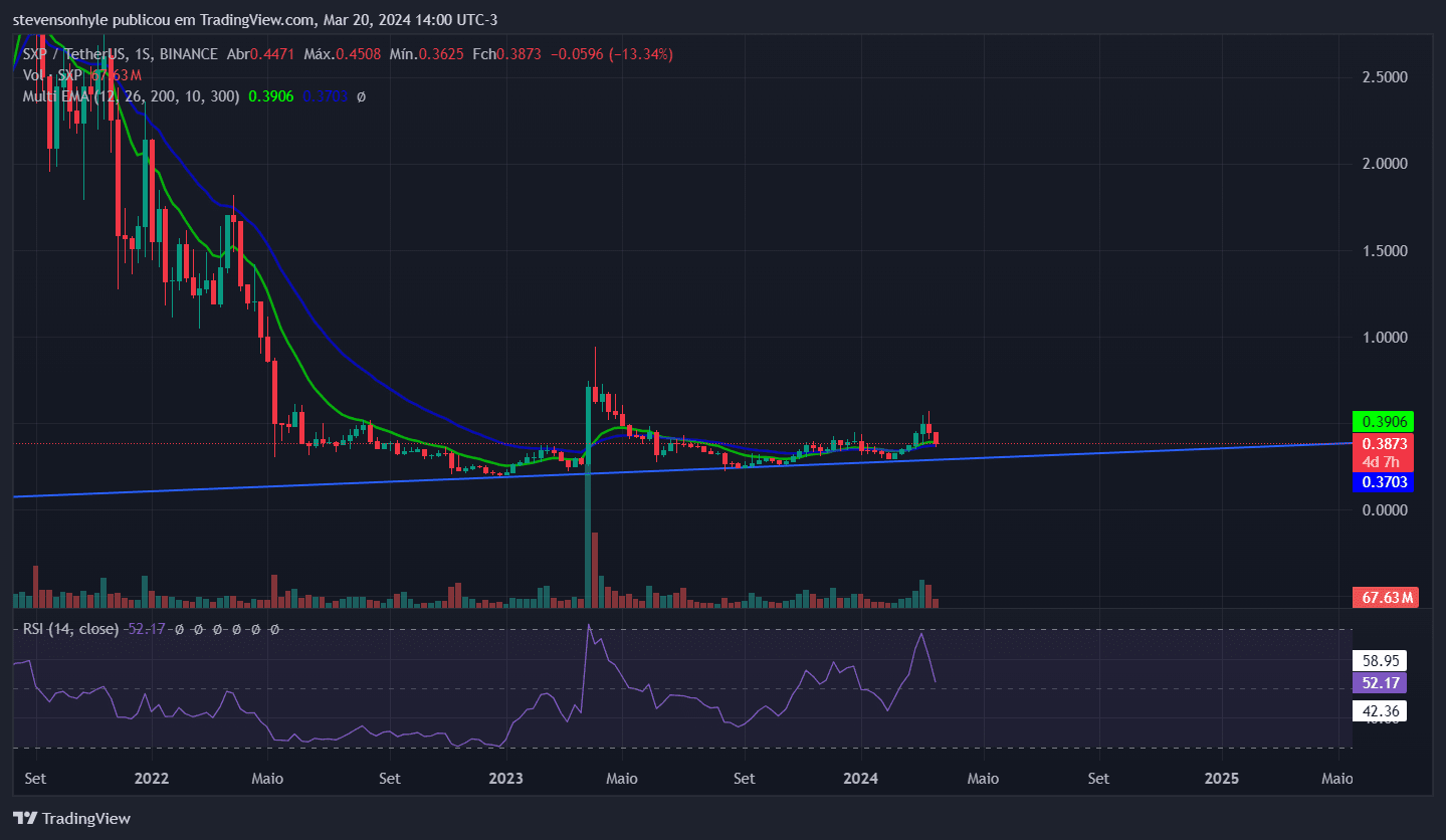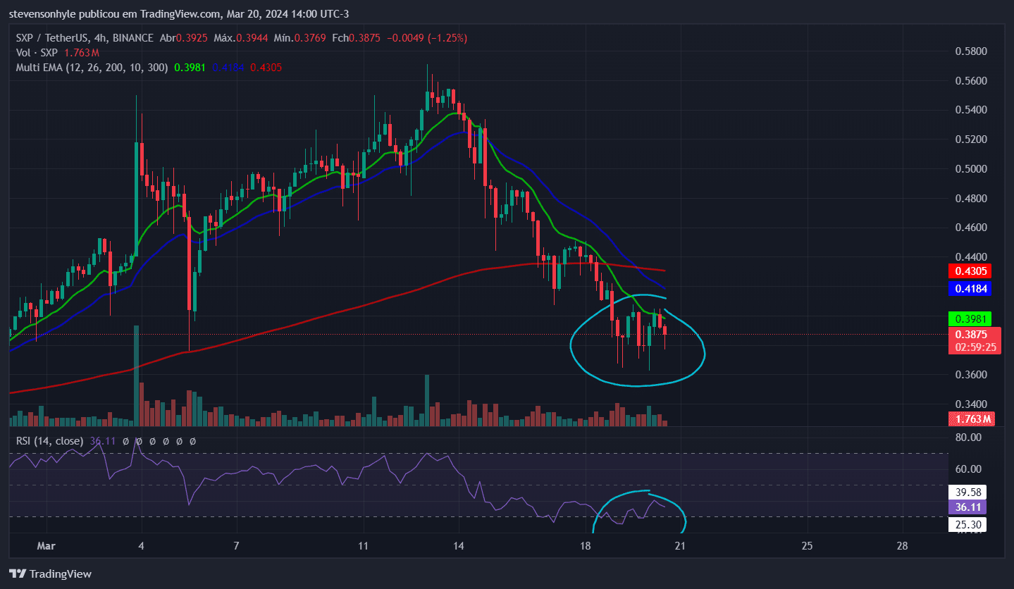 Nous avons également $SXP , qui sur le graphique hebdomadaire est resté sur une ligne de tendance haussière (LTA) et a utilisé les moyennes mobiles de 12 et 26 périodes comme support. De plus, sur le graphique de 4 heures, il a également atteint le niveau de survente RSI.