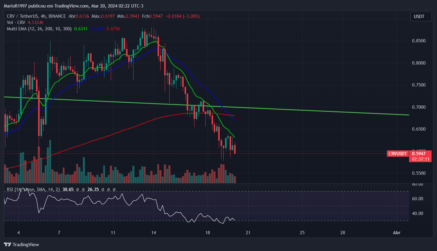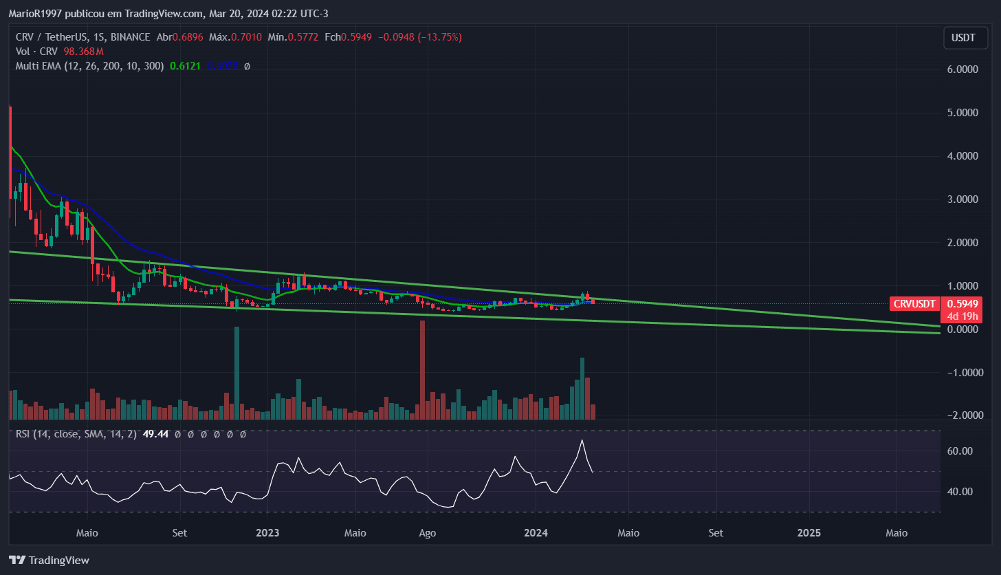 Le CRV, à son tour, qui sur le graphique hebdomadaire (1W) est toujours piégé dans une large configuration en biseau descendant, avec le RSI au niveau de survente sur le graphique de 4 heures.