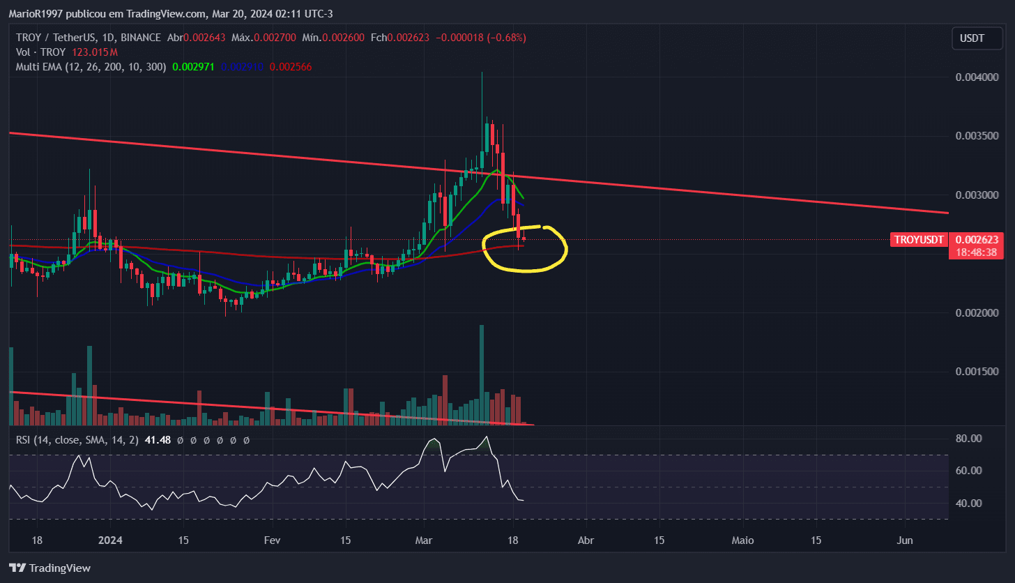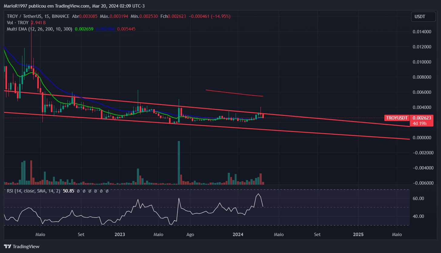 Une autre crypto-monnaie est $TROY , qui sur le graphique hebdomadaire (1W) est toujours piégée dans une large configuration en biseau descendant, qui a une probabilité plus élevée de cassure ascendante. Sur le graphique de 4 heures (4H), nous avons également atteint le niveau de survente RSI, ce qui peut indiquer une base de prix temporaire.