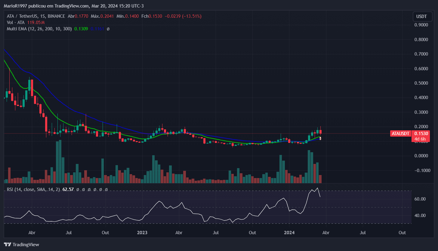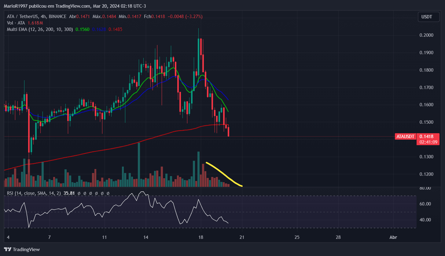 Poursuivant l'analyse, la crypto-monnaie ATA démontre la formation d'un support sur le graphique hebdomadaire (1W), en même temps que l'indicateur RSI atteint des niveaux de survente sur le graphique de 4 heures (4H). De plus, il utilise la moyenne mobile sur 200 périodes comme support, et une réduction du volume des ventes est constatée. Ces signes suggèrent la formation d’une base de prix solide pour cet actif.