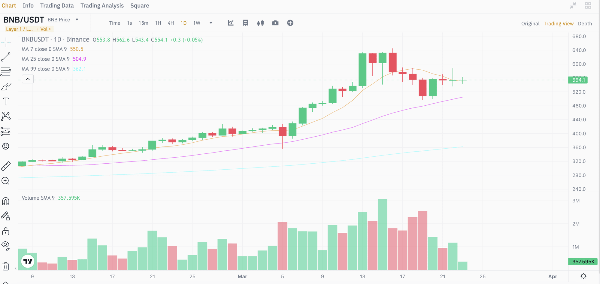 Ma prochaine ou deuxième cryptomonnaie est $BNB cette semaine. Pourquoi ? La réponse est simple et sur Binance, nous pouvons trouver une très bonne explication sur BNB : BNB est une cryptomonnaie qui peut être utilisée pour échanger et payer des frais sur la bourse de cryptomonnaie Binance. BNB est également la cryptomonnaie qui alimente l'écosystème BNB Chain. En tant que l'un des jetons utilitaires les plus populaires au monde, BNB est utile aux utilisateurs dans un large éventail d'applications et de cas d'utilisation.