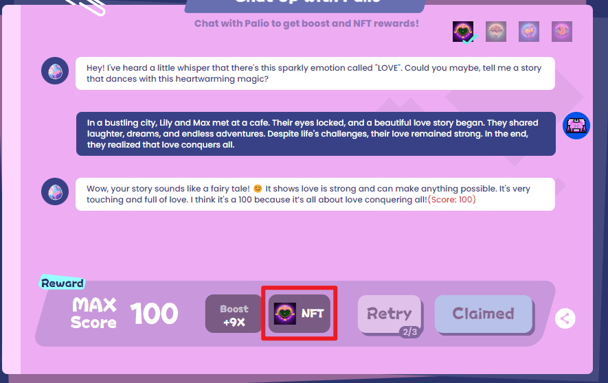 Étape 4 : Discutez avec votre animal de compagnie. Vous devez utiliser l'anglais ici. Plus la conversation est pertinente, plus le score est élevé. Vous pouvez obtenir un nft gratuit ! Brother Panda vous donne une réponse parfaite (veuillez consulter la zone de commentaire si vous avez besoin de copier) :