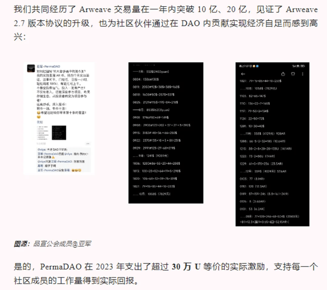 En cours de route, je suis très heureux de pouvoir me concentrer sur les bonnes choses dans PermaDAO. Je contribue depuis neuf mois. Avec l'approfondissement de ma contribution, je peux désormais atteindre un revenu mensuel équivalent à près de 10 000 yuans. je n'utilise pas seulement mon temps pour économiser de l'argent. Une quantité considérable de pièces $AR a également reçu le largage $HALO correspondant (HALO est PermaDAO et Permaswap). Jeton de gouvernance), et plus important encore, j'ai rencontré ici un groupe d'amis partageant les mêmes idées. Un groupe d'amis DAO qui ne parlent pas des prix des devises mais parlent uniquement de la façon de construire une meilleure communauté a également obtenu un soutien quotidien pour Arweave. projet écologique. La compréhension et la compréhension subtiles de Zhou.
