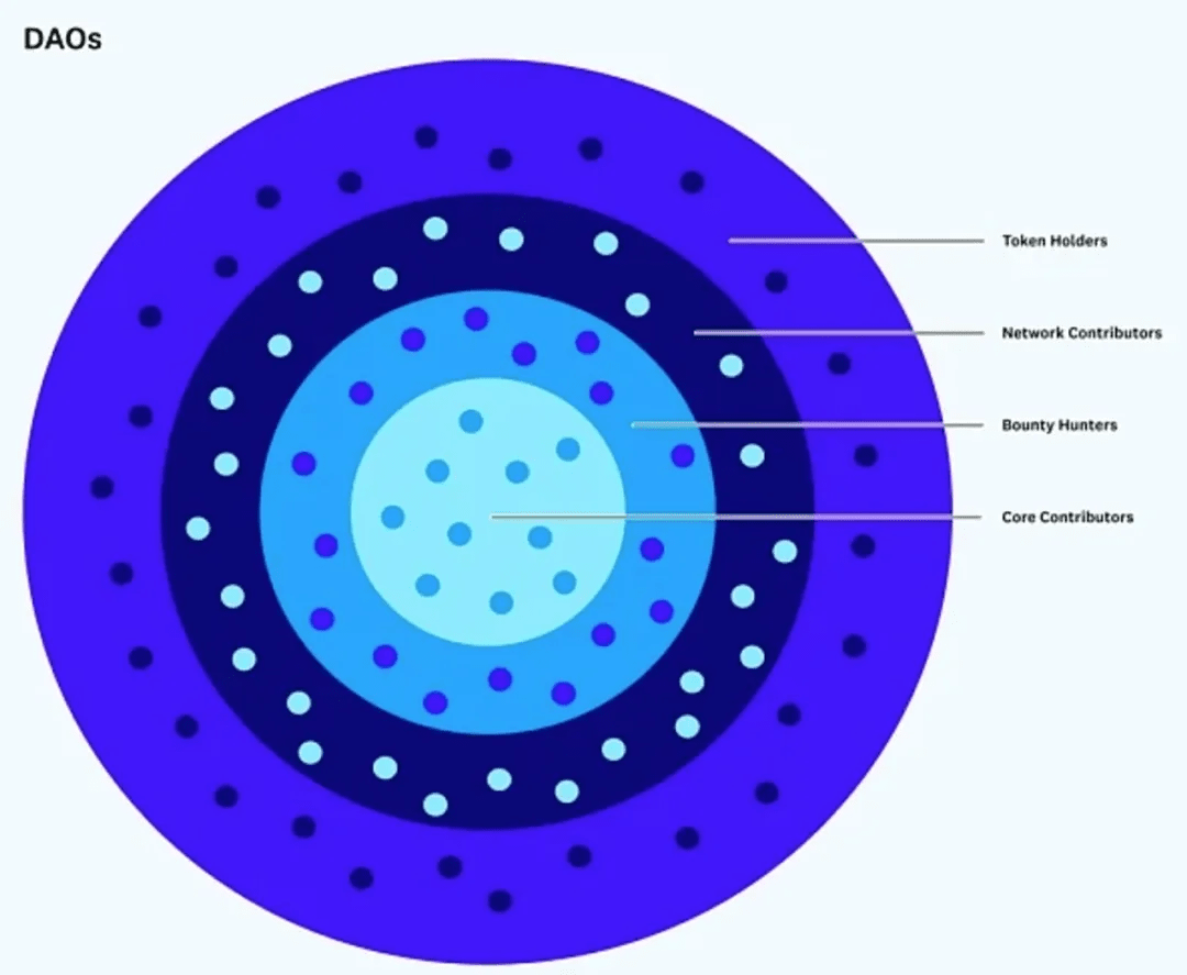 Comme le montre la figure, dans une organisation DAO, les individus peuvent contribuer en tant que détenteurs de jetons, participants au réseau, chasseurs de primes et contributeurs principaux, ce qui rendra le travail plus exigeant que le travail de neuf à cinq auquel nous sommes habitués. plus amusant. Par exemple: