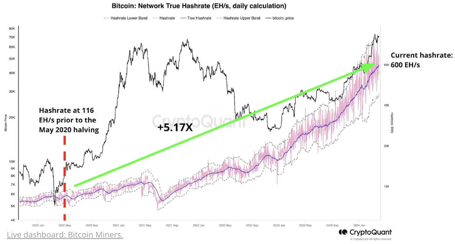 La récente augmentation du taux de hachage du réseau Bitcoin à 600 H/s indique une concurrence croissante entre les mineurs pour les mêmes récompenses.