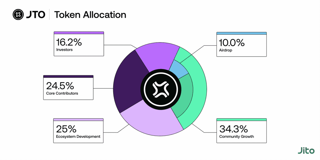 Expansion de la communauté (34,3 %) : Dédié à favoriser la croissance de la communauté Jito, un airdrop rétrospectif de 10 % reconnaît et encourage les contributions des membres de la communauté qui ont joué un rôle dans le démarrage du réseau.