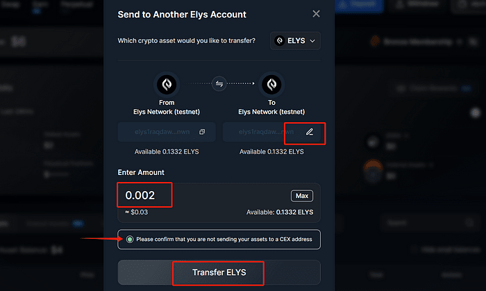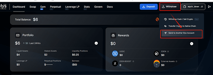 ➢ Cliquez sur « Retirer » et sélectionnez « Envoyer vers un autre compte Elys ». ➢ Saisissez l'adresse du destinataire (vous pouvez utiliser la vôtre), saisissez le montant et confirmez la transaction.